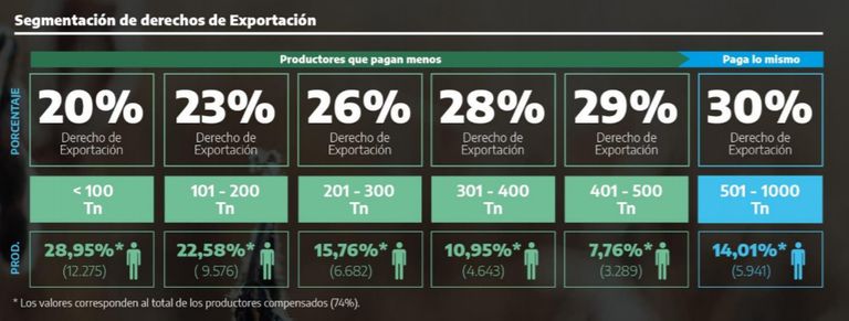 Esta segmentación implica que quienes producen hasta 100 toneladas, tributarán una retención del 21%; entre 100 y 200 toneladas, el 24%; entre 201 y 300 toneladas, el 27%; entre 301 y 400 toneladas, el 28%; entre 401 y 500 toneladas, la retención será del 29% y entre 501 y 1.000 toneladas llegará al 30%.