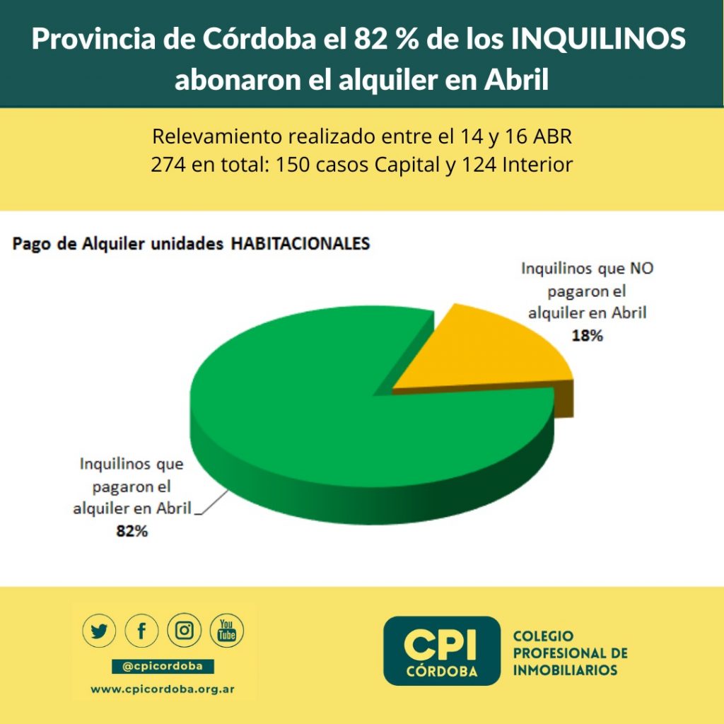 En la Provincia, el 82 % de los inquilinos pagó el alquiler de abril. Los datos surgen del relevamiento realizado por el Colegio Profesional de Inmobiliarios en todo el territorio de Córdoba.