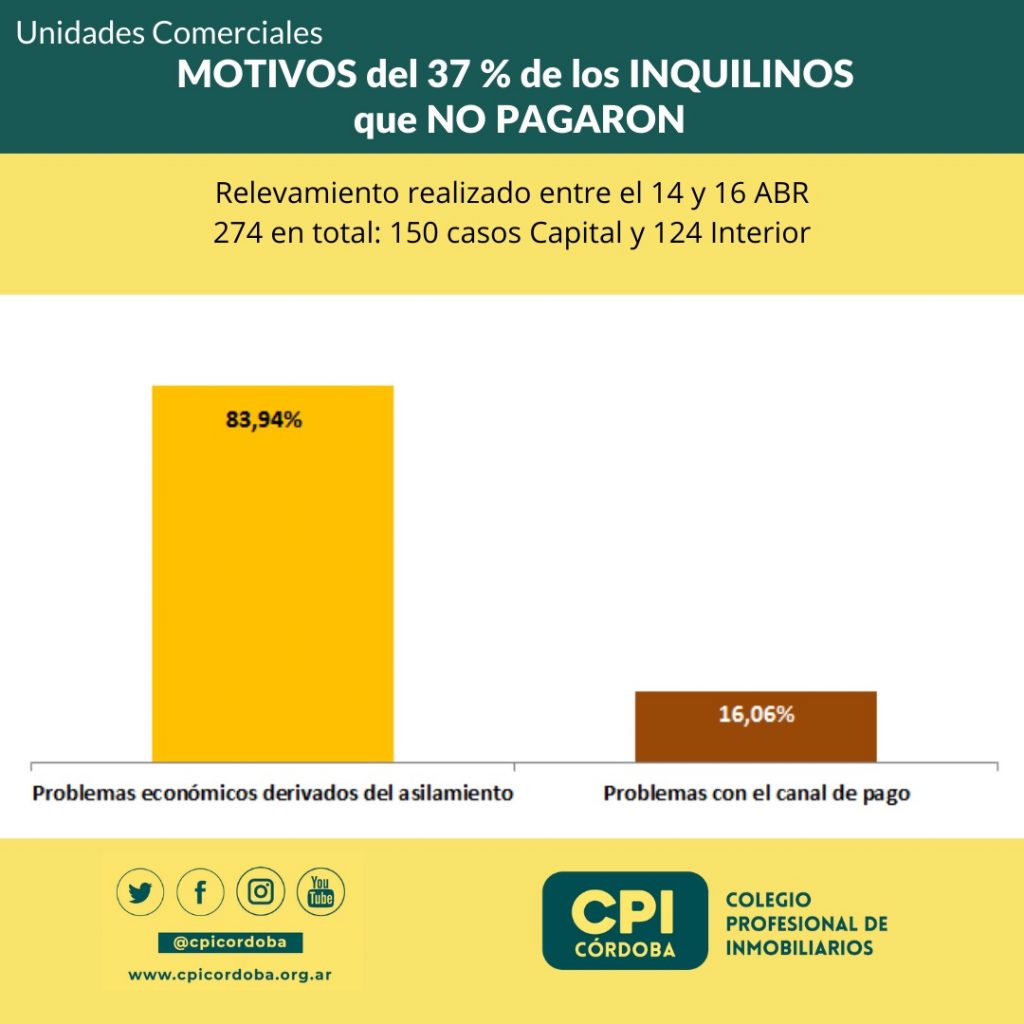 Con respecto a las unidades dedicadas a la actividad Comercial, el relevamiento indicó que un 62,77% abonó el alquiler en el mes de abril. Entre el 37,23% que no pudo pagar, un 83,94 % admitió que el aislamiento obligatorio fue la causa principal.