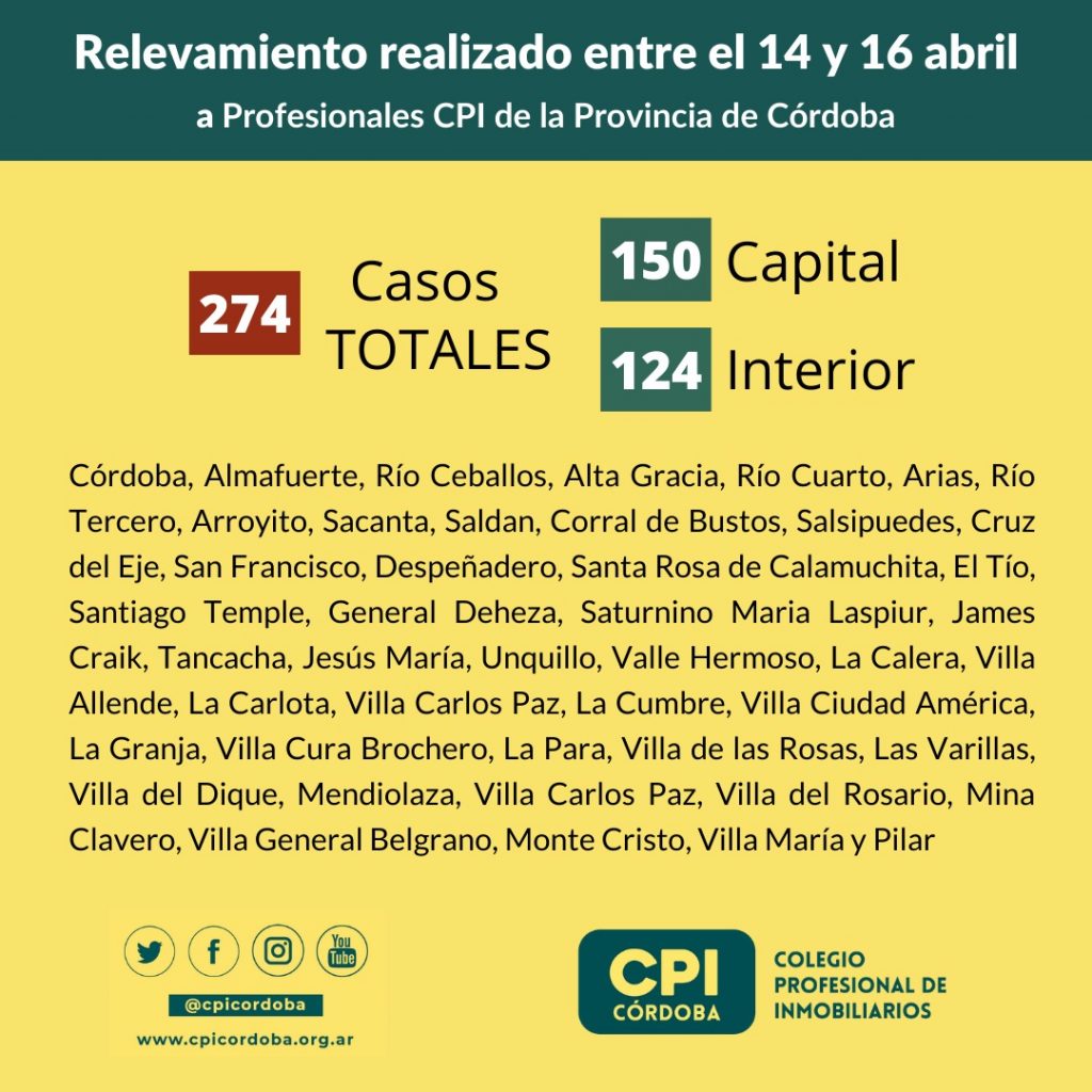 El informe se realizó entre el 14 y 16 de abril, entre quienes aproximadamente administran unas 15.895 unidades habitacionales (viviendas) y 4470 unidades dedicadas a la actividad Comercial (oficinas, comercios, galpones, etc). La muestra se distribuyó en 150 Profesionales en Córdoba Capital y 124 de ciudades de toda la provincia, entre ellas Río Cuarto.