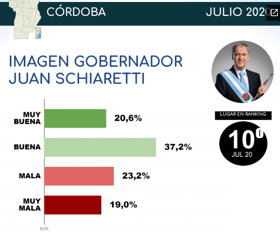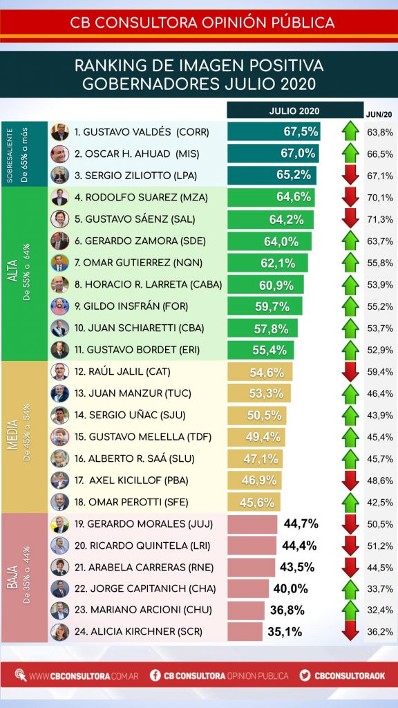- Tres gobernadores terminaron con una imagen positiva sobresaliente durante el mes de Julio: Gustavo Valdés de Corrientes ( 67,5% ), Oscar Herrera Ahuad de Misiones ( 67,0% ) y Sergio Ziliotto de La Pampa ( 65,2% ).