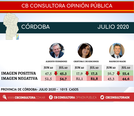Según la encuesta del mes de julio de CB Consulora, el Presidente Alberto Fernández posee su imagen positiva más alta en la Provincia de Santiago del Estero ( 79,4% ) y su imagen positiva más baja en la Provincia de Mendoza ( 41,2% ). La provincia donde más aumentó su imagen positiva con respecto al mes anterior es Santa Fe (+ 4,2 puntos), mientras que en Ciudad de Buenos Aires es donde más bajó su imagen positiva con respecto al mes de Junio (- 7,4 puntos )
