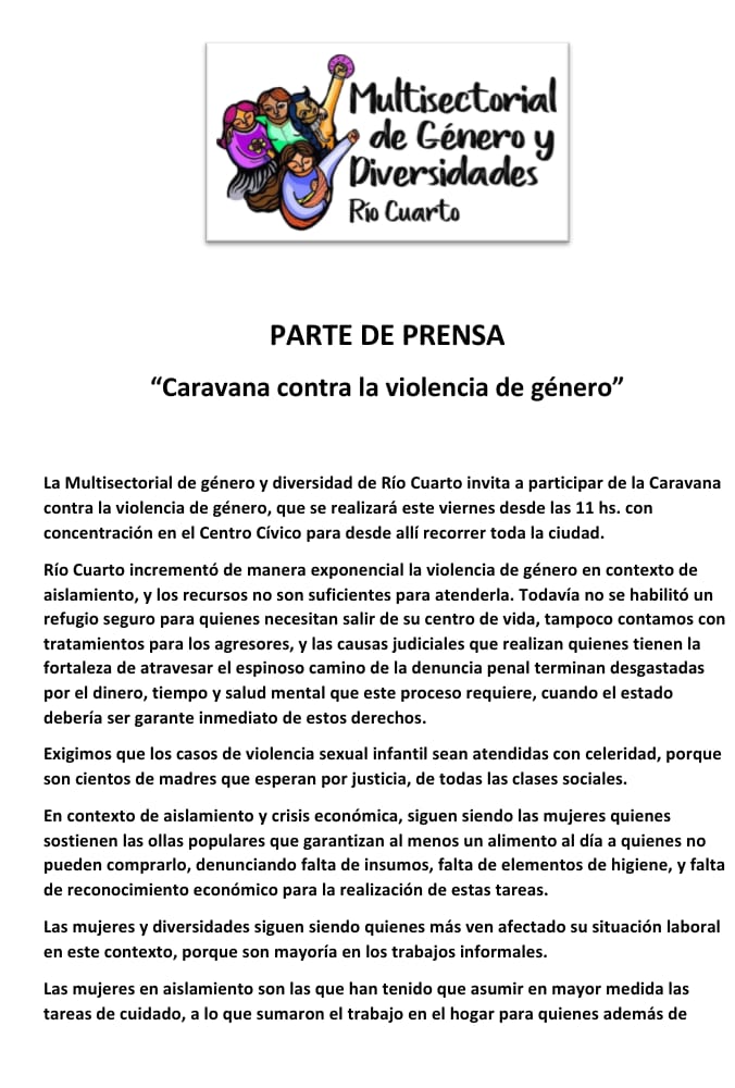 La Multisectorial de género y diversidad de Río Cuarto invita a participar de la Caravana contra la violencia de género, que se realizará este viernes desde las 10 hs. con concentración en el Centro Cívico para desde allí recorrer toda la ciudad.