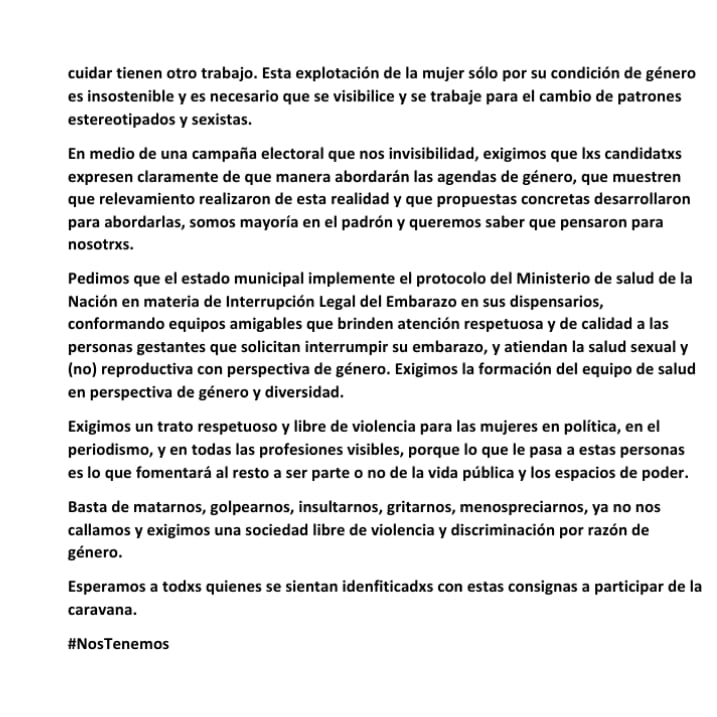 En medio de una campaña electoral que nos invisibilidad, exigimos que lxs candidatxs expresen claramente de que manera abordarán las agendas de género, que muestren que relevamiento realizaron de esta realidad y que propuestas concretas desarrollaron para abordarlas, somos mayoría en el padrón y queremos saber que pensaron para nosotrxs.