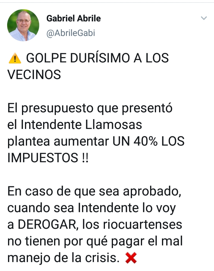 El candidato a intendente de Juntos por Río Cuarto, Gabriel Abrile, cuestionó la suba impositiva prevista en el presupuesto municipal del próximo año.
