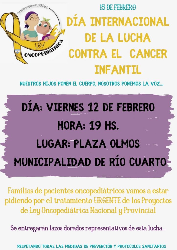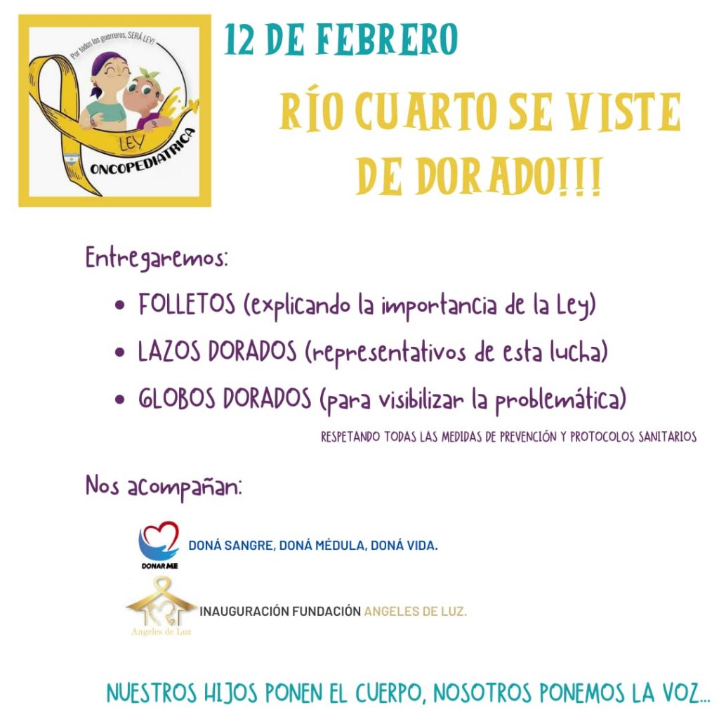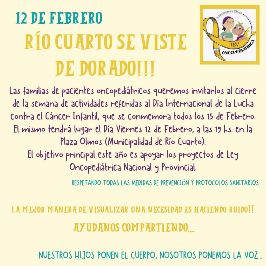 En el cierre de la semana de concientización sobre el cáncer infantil, Río Cuarto se viste de dorado. El encuentro será este viernes, a las 19, en Plaza Olmos.