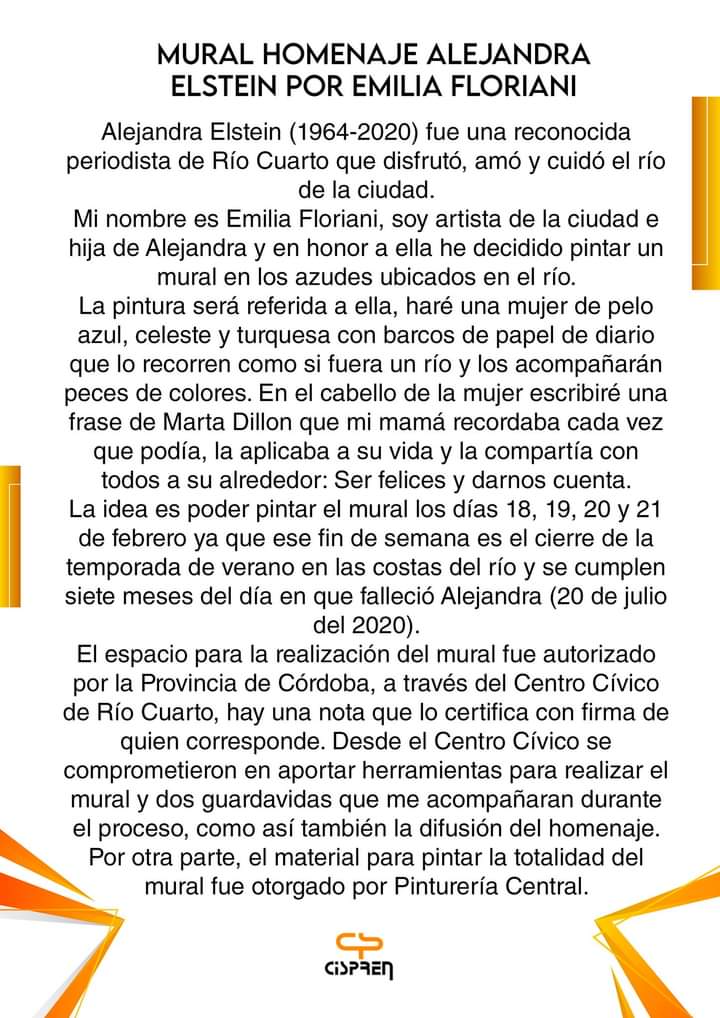 Emilia Floriani impulsa la realización de un mural en homenaje a su mamá, la entrañable periodista Alejandra Elstein. Desde el Cispren manifestaron su adhesión a la propuesta.