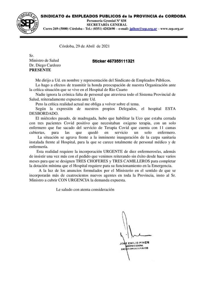 Desde el Sindicato de Empleados Públicos advierten que el Hospital de Río Cuarto “está desbordado” y denuncian “una crónica falta de personal”. Lo señaló el secretario general del gremio, José Pihen, en una carta enviada al ministro de Salud, Diego Cardozo.