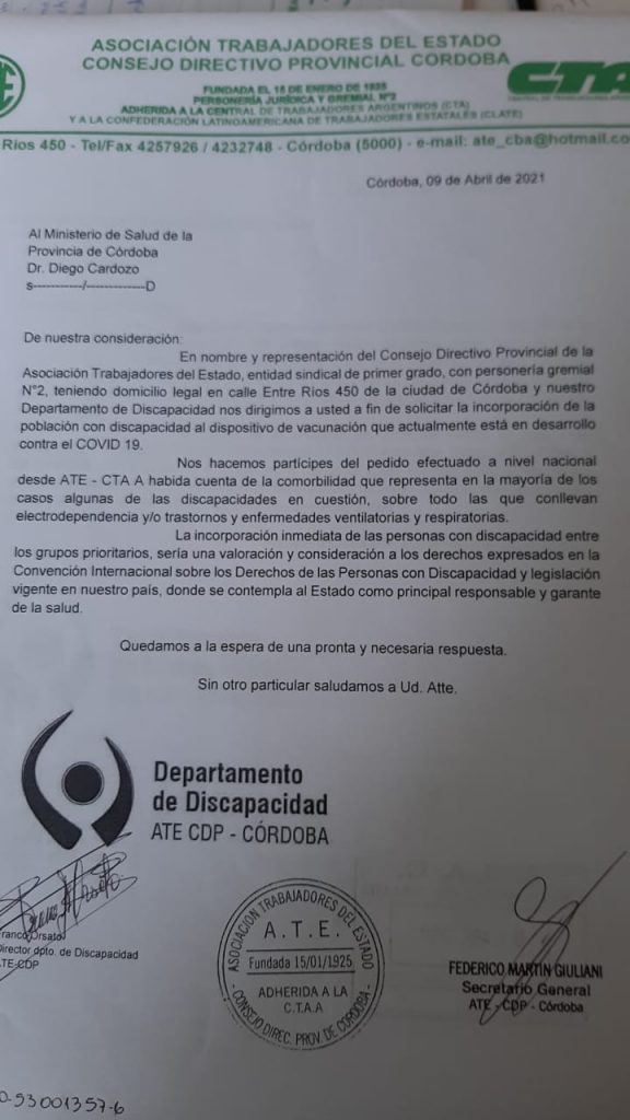 Desde el gremio de la Asociación de Trabajadores del Estado piden “la incorporación inmediata” de personas con discapacidad en el plan de vacunación. Así lo señala una carta enviada al ministro de Salud de la Provincia, Diego Cardozo.