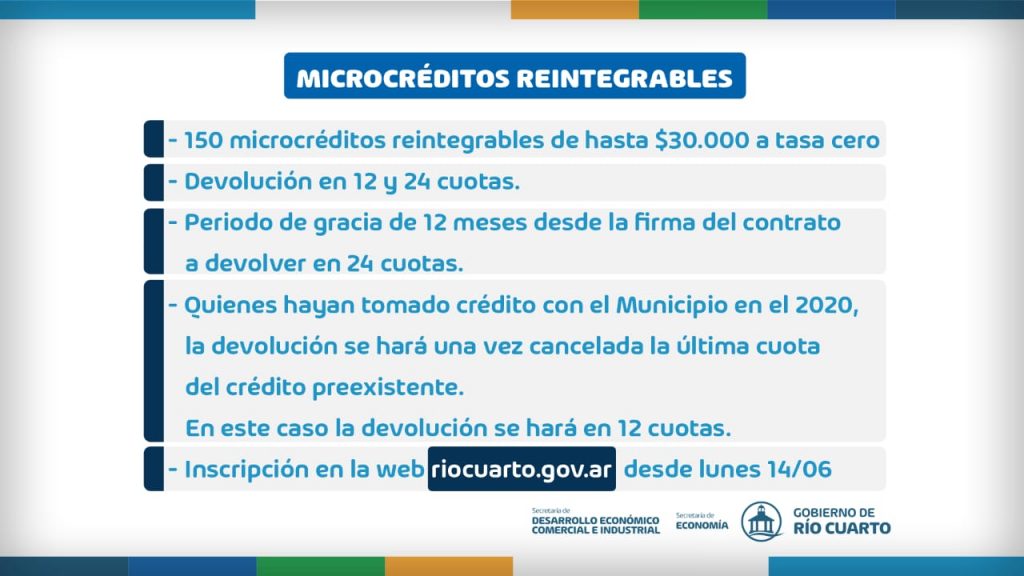 A partir del lunes, los comercios riocuartenses afectados por las restricciones en la actividad podrán solicitar los micro créditos hasta 30 mil pesos que promueve el municipio de Río Cuarto. En el Ejecutivo creen que el jueves se aprobará el proyecto en el Concejo Deliberante y la semana que viene comenzará la inscripción a través de la página oficial www.riocuarto.gov.ar. El secretario de Economía Pablo Antonetti precisó que serán 150 préstamos a tasa cero, aunque esperan una fuerte demanda que promueva un 50 por ciento más de créditos.