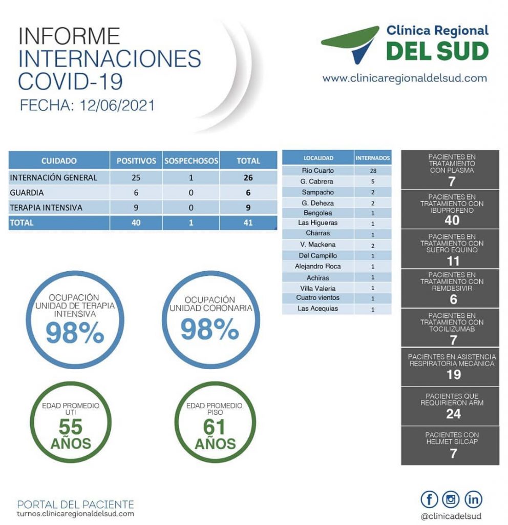 Desde la Clínica Regional del Sud informaron que “la ocupación de camas para pacientes con Covid-19, continúa siendo plena, con el agravante de que la estadía de los pacientes es cada vez más extensa, haciendo que la situación sea aún más crítica”.