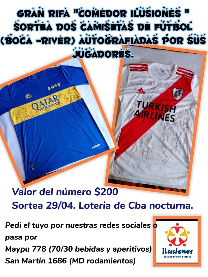 El costo del número es de solo 200 pesos y el sorteo de las cámisetas se realizará el 29 de abril, a través de la Lotería de Córdoba nocturna. Para adquirir el bono es necesario contactarse con el comedor o bien, dirigirse a Maipú 778 o San Martín 1686.