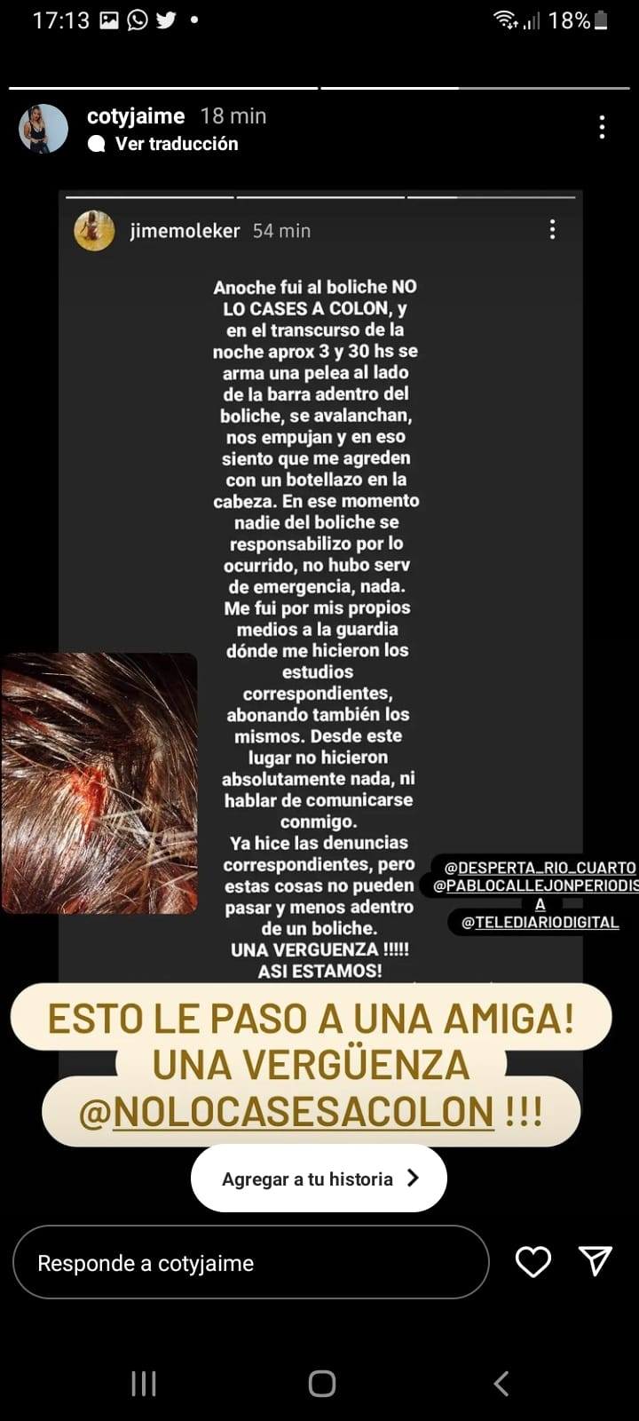 Jimena resaltó que: “solo me sacaron del boliche y me dieron una servilleta porque me sangraba la cabeza”