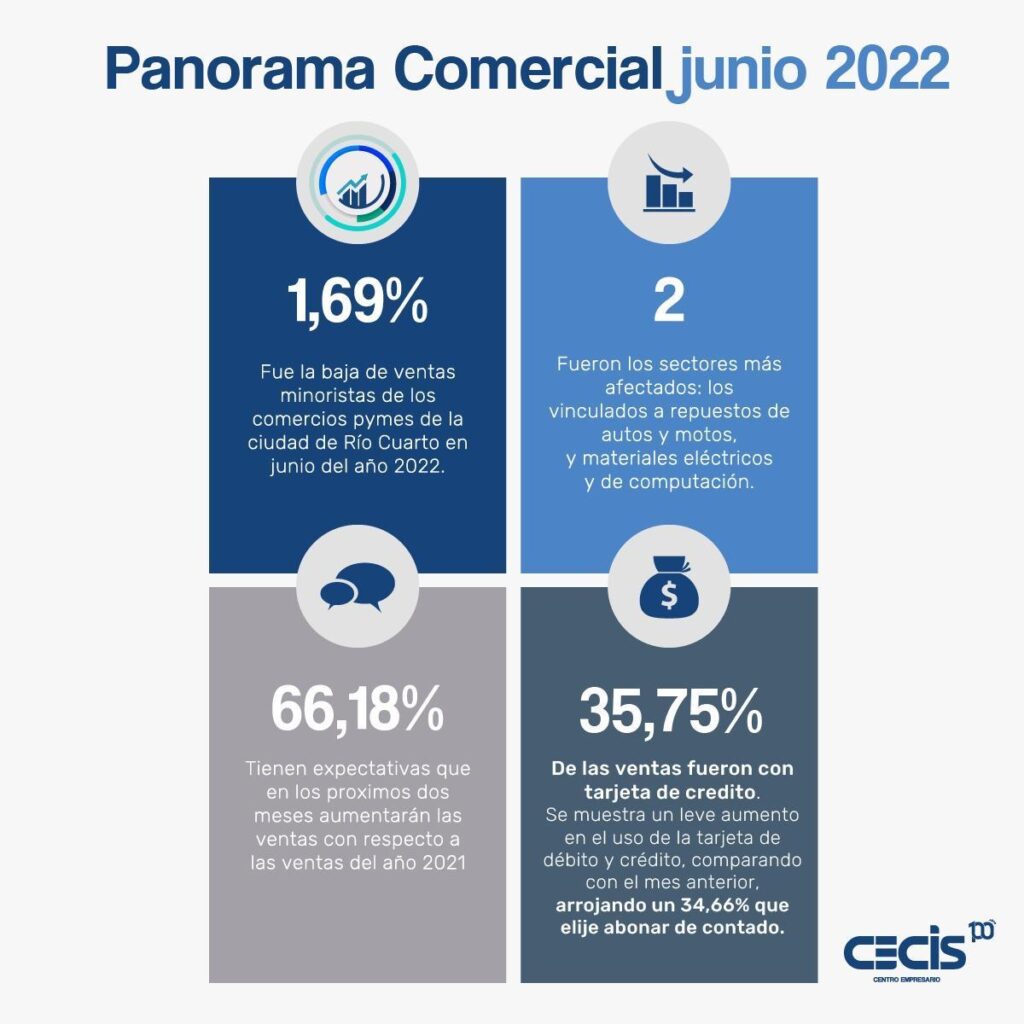 Las ventas minoristas de los comercios pymes de Río Cuarto finalizaron junio con una baja del 1,69% en cantidades de unidades vendidas, con respecto a igual mes del año 2021. El dato surge de los datos relevados por el Centro Empresario, Comercial, Industrial y de Servicios (CECIS).