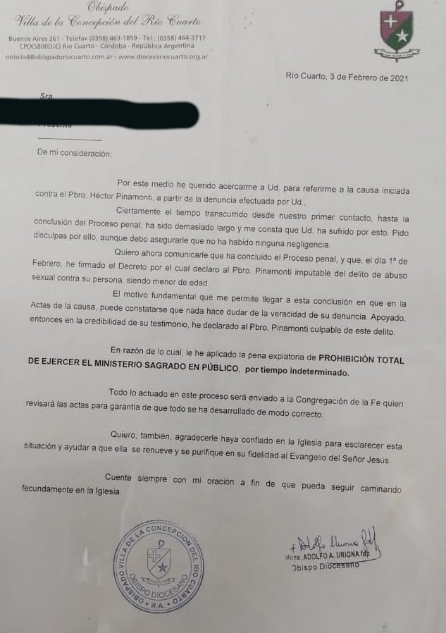 Tras el informe periodístico que reveló la condena canónica al sacerdote Pinamonti por el abuso sexual de una niña, Pinamonti no fue exonerado de la Iglesia y la pena se redujo a una “suspensión sacerdotal por tiempo indeterminado¨”.