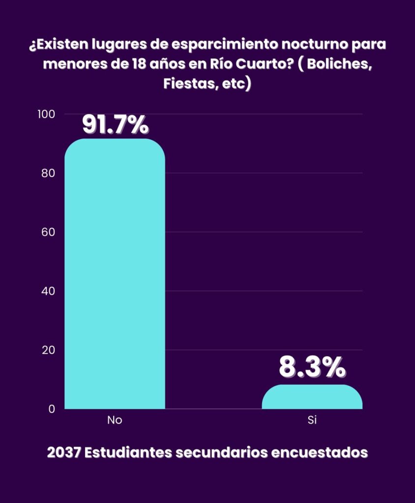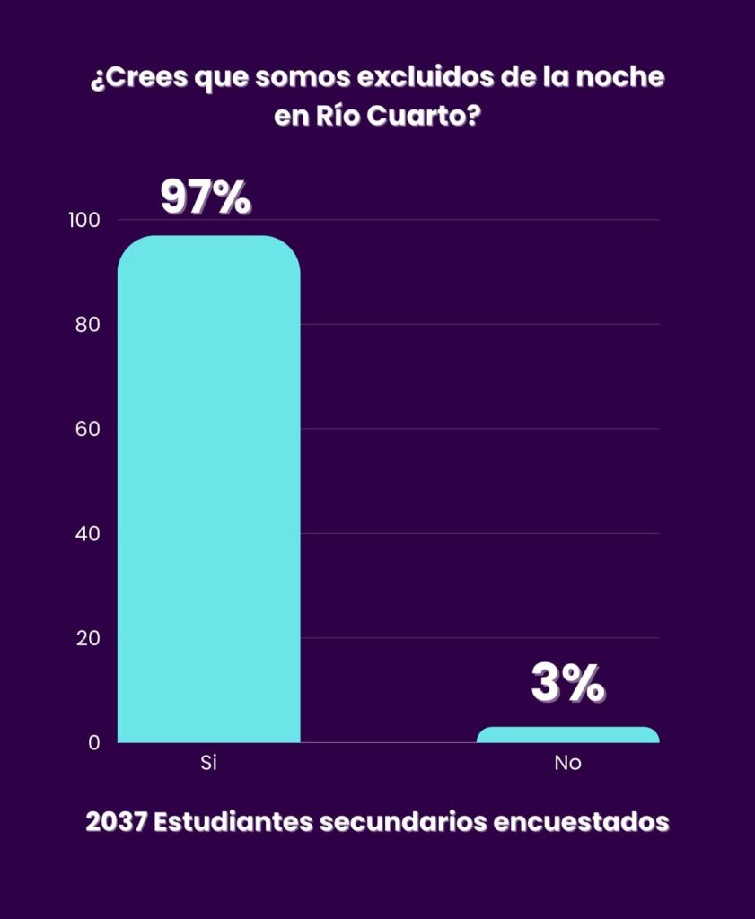 El 97% de los adolescentes de Río Cuarto se siente excluido de las opciones para salir y advierte que la noche “es muy insegura”. Así lo reveló una encuesta de la Unión de Estudiantes Secundarios en más de 15 colegios secundarios públicos y privados.