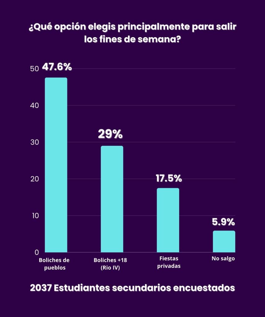 2037 adolescentes respondieron la consulta que busca poner en debate una problemática que afecta a jóvenes de entre 14 y 17 años. “Destacamos principalmente la gran cantidad de estudiantes que se sienten excluidos por la falta de un espacio físico adecuado para salir los fines de semana. Además, la inseguridad en los boliches de nuestra ciudad es preocupante, debido a la ausencia de controles adecuados”, señalaron desde la UES.