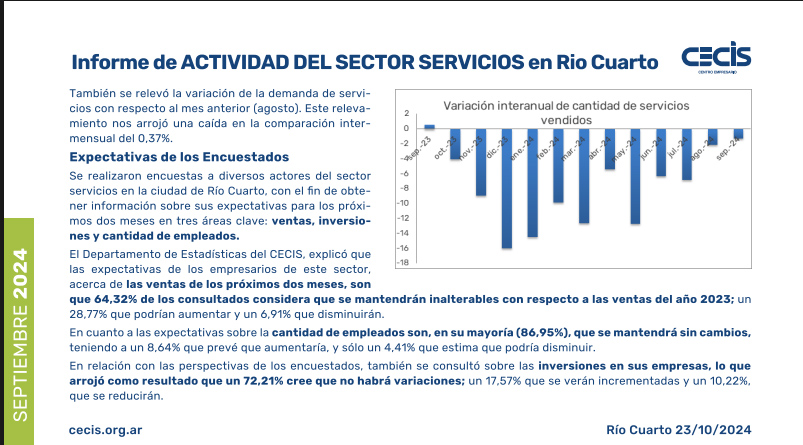 Además de las caídas en el sector comercio y la industria, se desploman los servicios en Río Cuarto, según el informe del CECIS. “Los sectores mayormente afectados fueron los vinculados con consultoras y gastronomía, que mostraron bajas superiores al 10% en comparación septiembre del 2023”, precisaron. El informe reveló que, “a nivel general, la actividad en las empresas de servicios de la ciudad de Río Cuarto finalizó el mes de septiembre con una caída del 1,32%, comparando valores con el mismo mes del año anterior”.