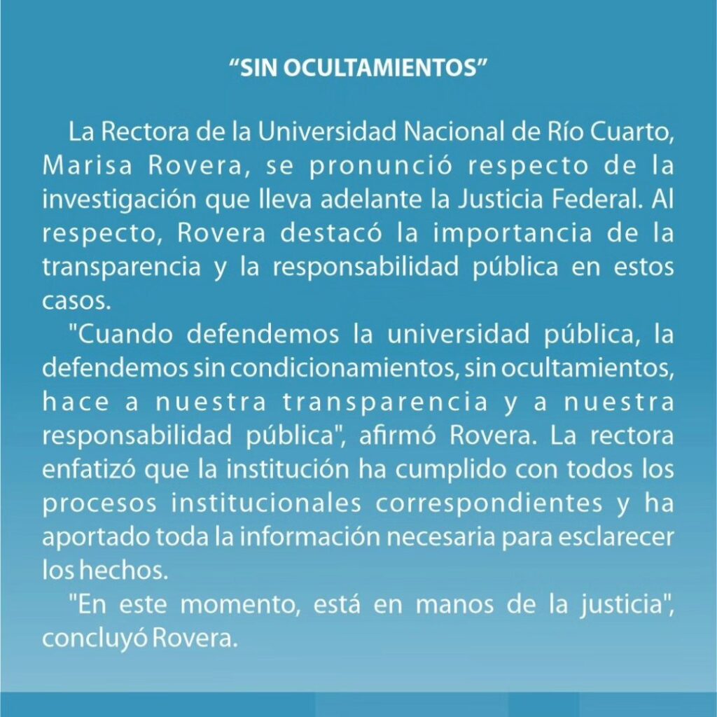 “Defendemos la universidad pública sin ocultamientos, la UNRC aportó todo lo necesario para esclarecer el hecho”, afirmó en un comunicado la Rectora de la Universidad Nacional de Río Cuarto, Marisa Rovera, tras los operativos ordenados por el Juzgado Federal en laboratorios y dependencias de la Facultad de Ciencias Exactas, por el uso ilegal que habrían realizado un grupo de investigadores de instrumental y espacios universitarios.